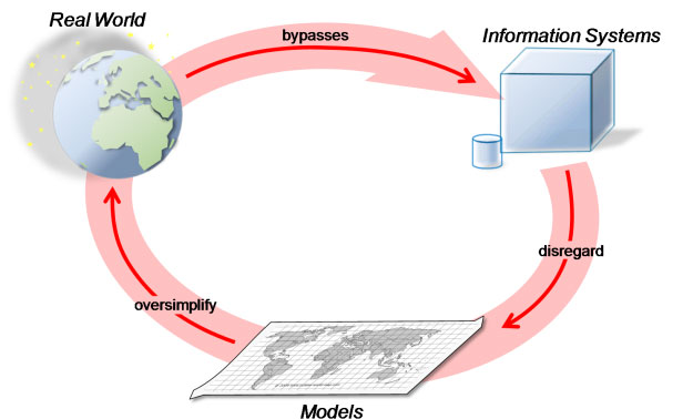 Unfortunately, this simple circle, that can be called virtuous, is often interwoven with a vicious one in which Models oversimplify the reality or have been built on wrong assumptions ; Information Systems, due to both technological limits or misunderstandings, disregard the models and, in addition, the Real World makes every effort for bypassing the rules implemented in the Information Systems.