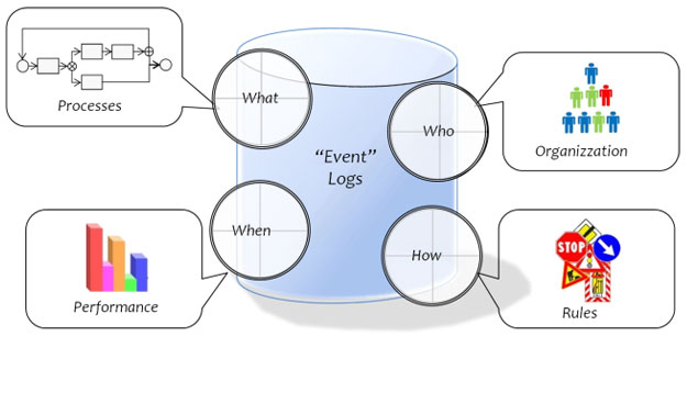 - Process: a simple ordinate sequence of events, related to specific process instances and tasks, allows to concentrate on the aspects specifically related to the task flow: workflows can be mined and analyzed.